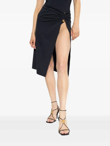 Add some oomph to your beach look with this skirt's edgy black fabric and bold Medusa Head motif. The gathered detailing and side slit make it effortlessly stylish and comfortable. Made of 78% polyamide and 22% elastane for the perfect stretchy fit.