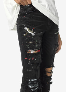 JEAN 5 POCHES EN DENIM STRETCH ITALIEN AVEC ABRASIONS TRAITÉES À LA MAIN ET DÉTAILS D'ÉCLABOUSSURES DE PEINTURE