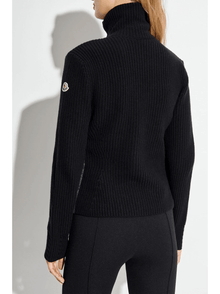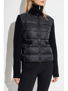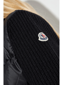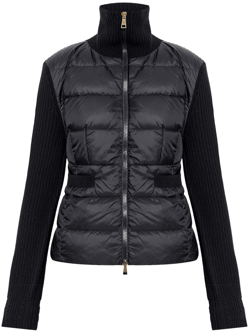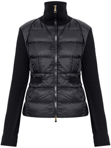 Get cozy and stylish with Moncler's padded zip-up cardigan. Made from soft virgin wool and filled with feather down, this cardigan will keep you warm while the high neck and fitted waistline provide a flattering fit. Featuring a logo patch and contrasting-fabric sleeves, this cardigan is a must-have for any winter wardrobe.