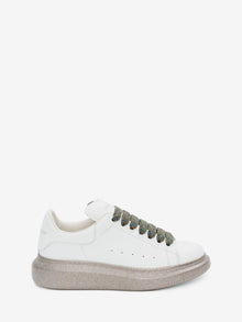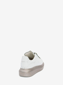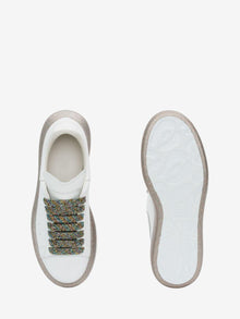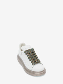 White smooth calf leather sneaker with a rounded toe and an oversized multicolor glitter sole. The sneaker features large flat glitter laces with metallic flecks and is finished with an Alexander McQueen signature on the heel counter and tongue. The sneaker comes with an additional set of shoelaces.