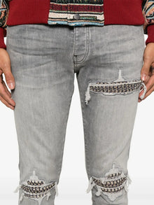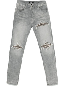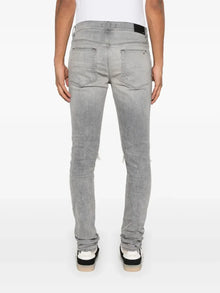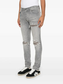 Get ready to rock in these AMIRI MX1 Bouclé jeans. The light grey color is perfect for any occasion while the button fly fastening and classic five pockets provide functionality. The ripped detailing adds a touch of edge, and the logo patch on the rear adds a subtle touch of branding. Made with a comfortable blend of cotton, elastomultiester, and spandex. Step out in style, effortlessly.
