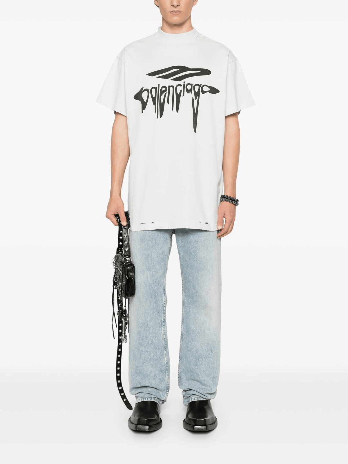 Get ready to stand out in style with the Balenciaga 3B Liquified Oversize t-shirt. This light grey tee features a bold logo print on the front and a classic crew neck design. Made with 100% cotton, it's the perfect blend of comfort and fashion. And with its unisex sizing, it's perfect for anyone looking for a unique and trendy addition to their wardrobe.