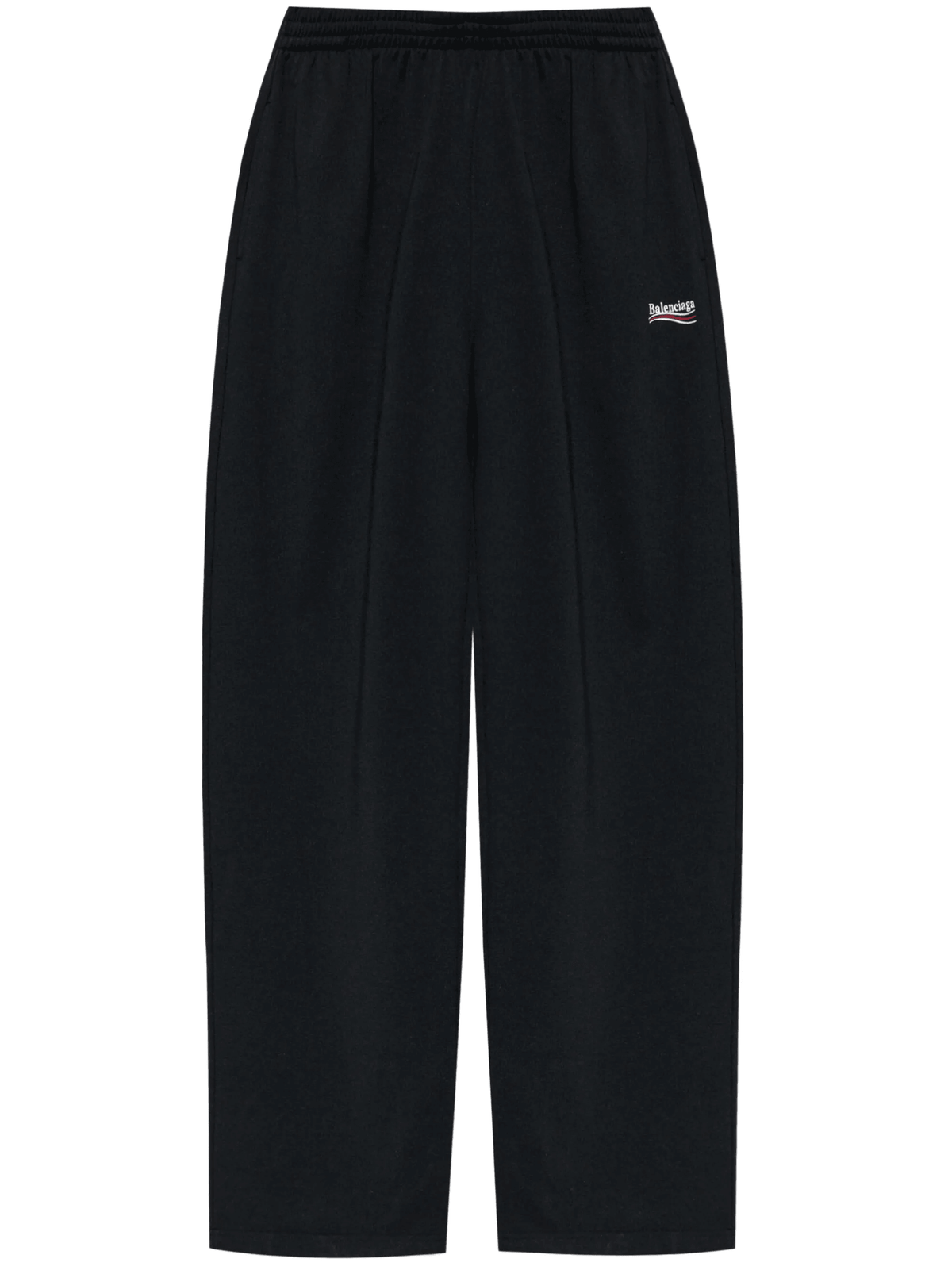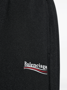 Make a statement in these Balenciaga Political Campaign track pants. Featuring a bold embroidered logo and an elasticated waistband, these black pants are not only stylish but also comfortable. Made of 100% polyamide, they are perfect for making a bold fashion statement.
