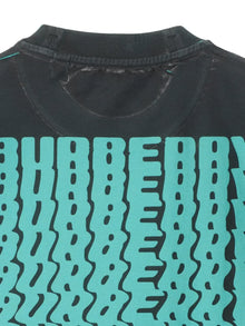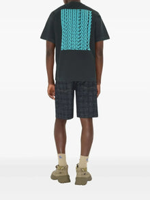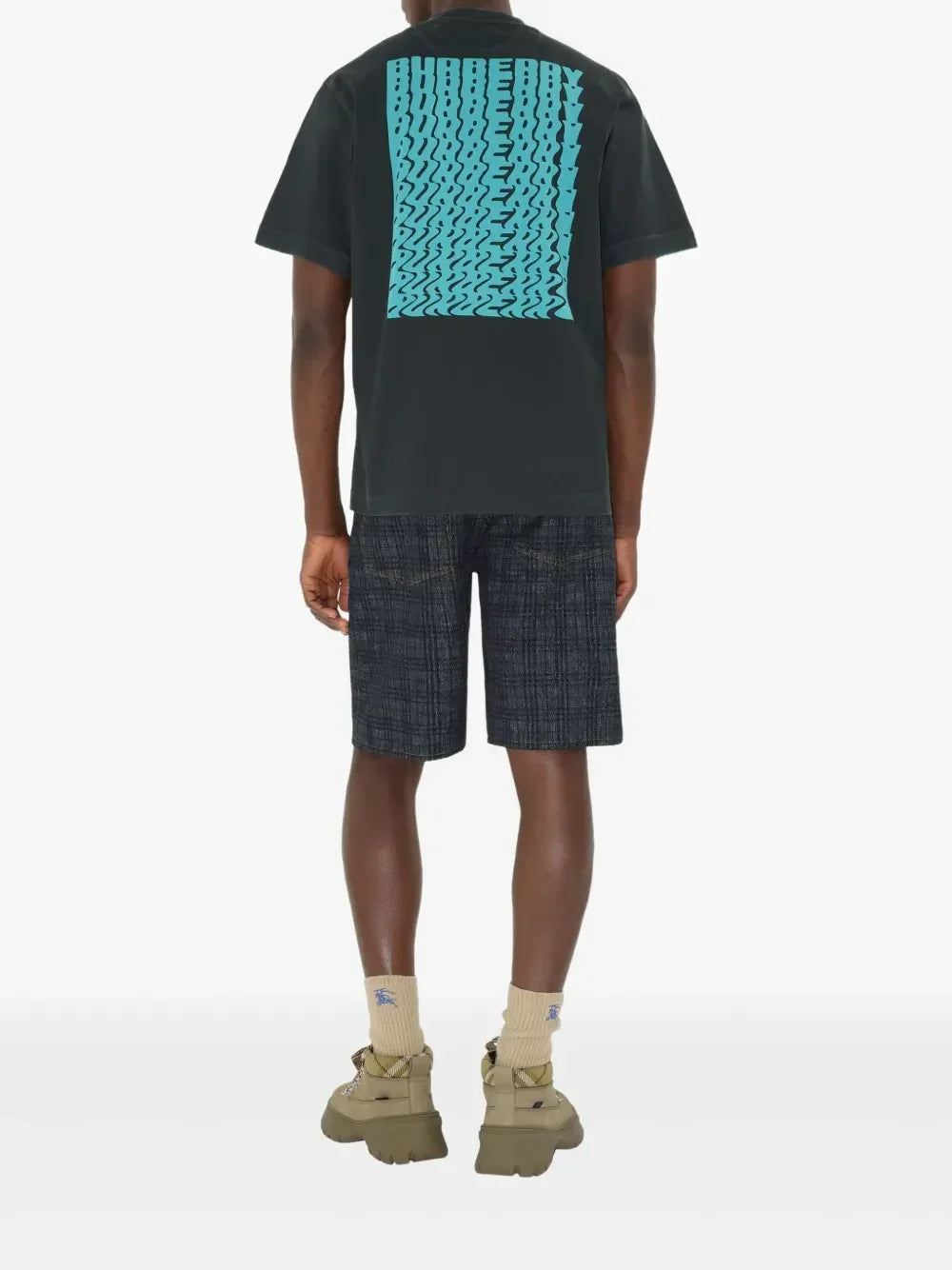 This Burberry logo-print t-shirt combines classic style with a modern edge. Featuring a sleek grey color and a striking turquoise logo print on the back, it adds a bold statement to any casual outfit. Designed with comfortable short sleeves and a round neck, it offers an effortless fit perfect for everyday wear. Elevate your wardrobe with this versatile and stylish piece.