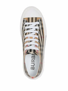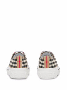Step out in style with these Burberry Vintage check cotton sneakers. Featuring a playful Vintage Check pattern in archive beige, these sneakers also boast a front lace-up fastening and contrasting toecap for added flair. The flat rubber sole provides comfortable all-day wear, while the embossed logo on the rear adds a touch of sophistication.
