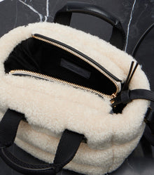 Crafted in Italy from cozy cream teddy, the mini-sized bag features smooth leather trim, top handles, and a detachable, adjustable leather shoulder strap, offering versatile ways to carry.