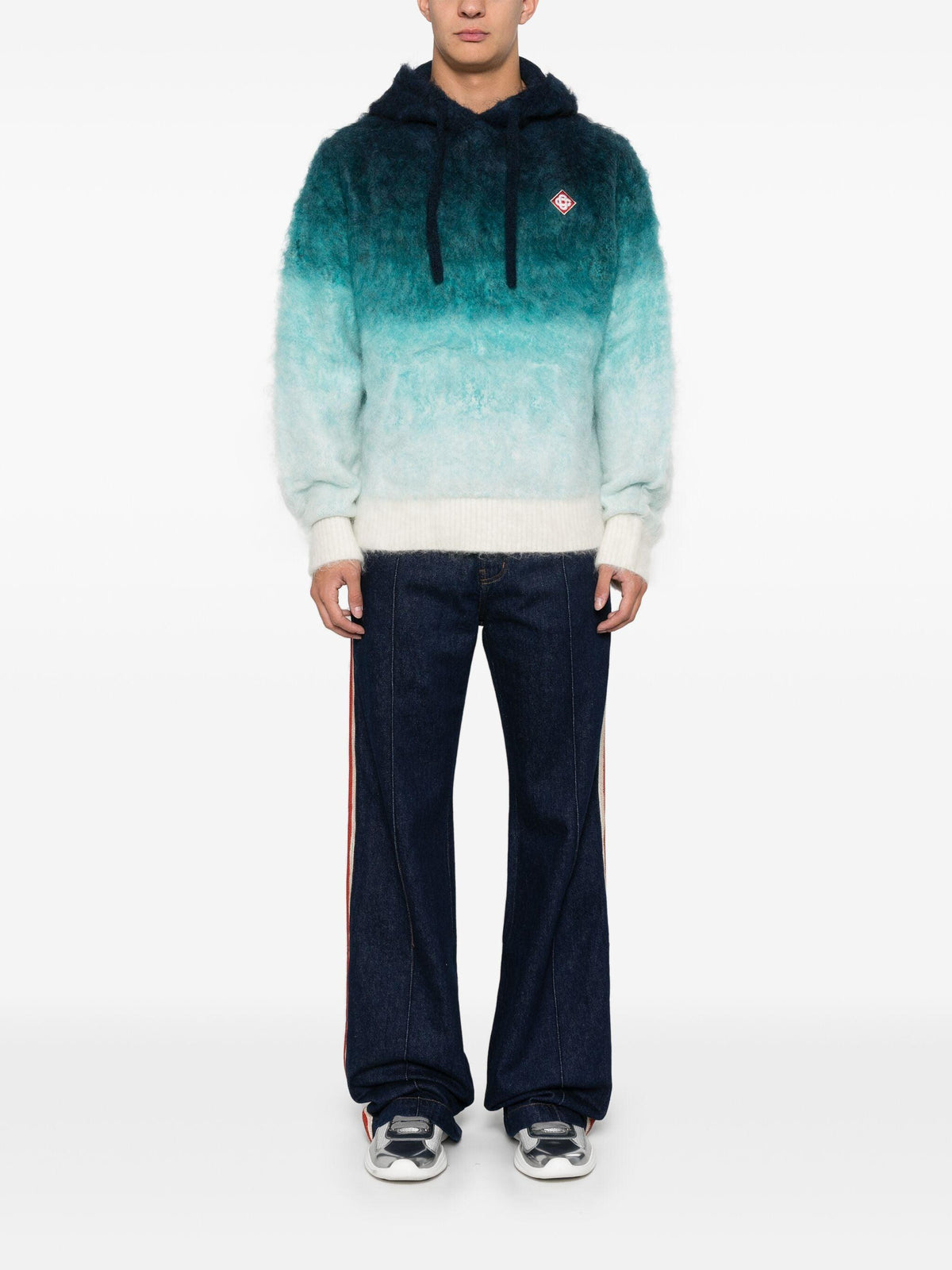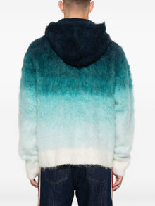 Stay cozy and stylish in our Casablanca gradient hoodie. Crafted from a mohair-wool blend, the felted fabric creates a unique gradient effect in aqua blue. With a drawstring hood and logo patch, it's the perfect blend of comfort and cool. Bonus: keep your hands warm in the front pouch pocket.