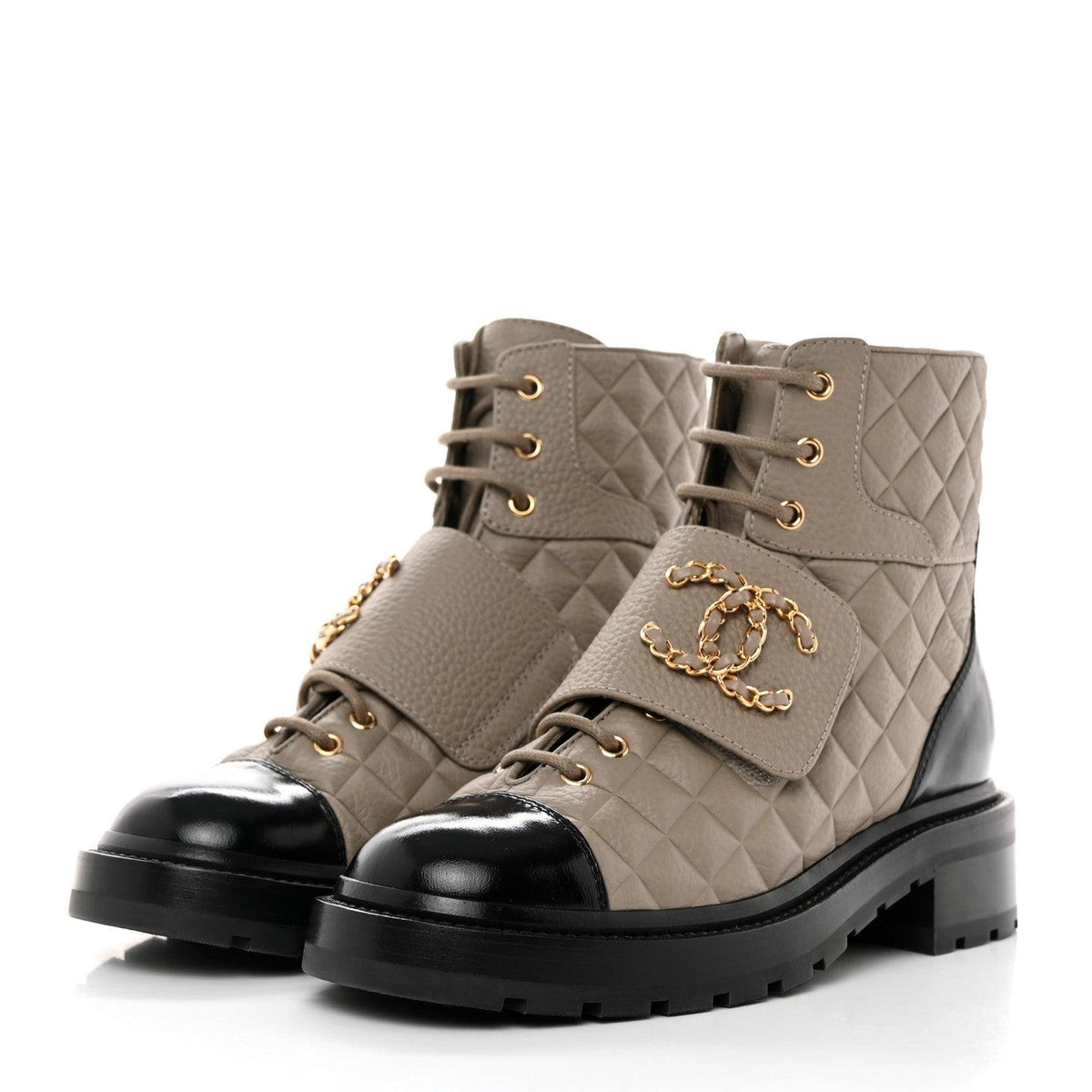 CHANEL Calfskin Shiny Calfskin Quilted Lace Up Combat Boots Dark Beige Black
