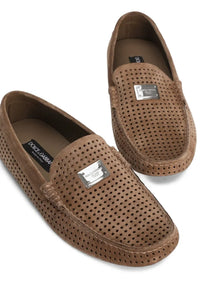 Slip into sophistication with these light brown perforated loafers from Dolce & Gabbana! These fancy foot friends feature a comfy rubber sole for all-day strutting, a flashy silver-tone logo plaque that screams "I've arrived," and a branded insole that hugs your feet like they're VIPs. Holes never looked so cool!