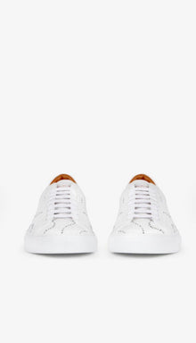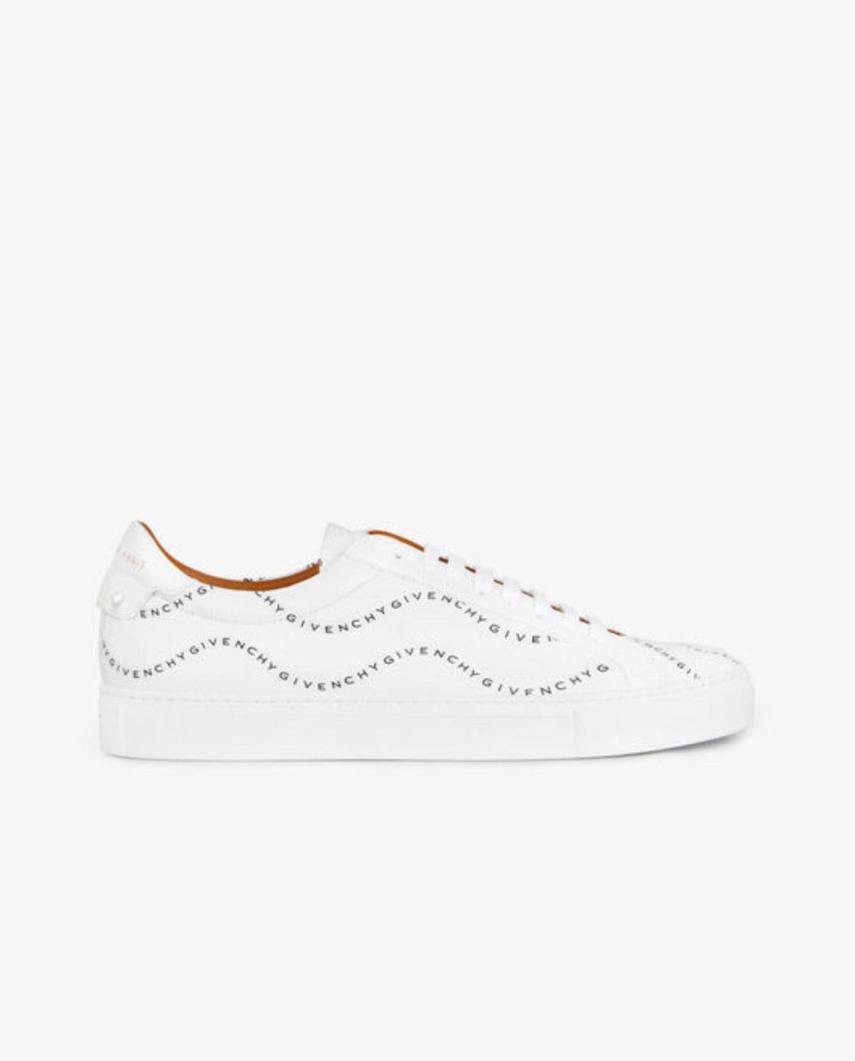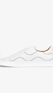 Urban Street sneakers in matte white leather with black GIVENCHY Waves print and red GIVENCHY PARIS signature on the tongue. Solid white leather inset, knots, and red GIVENCHY PARIS signature on the back. Natural leather insole.