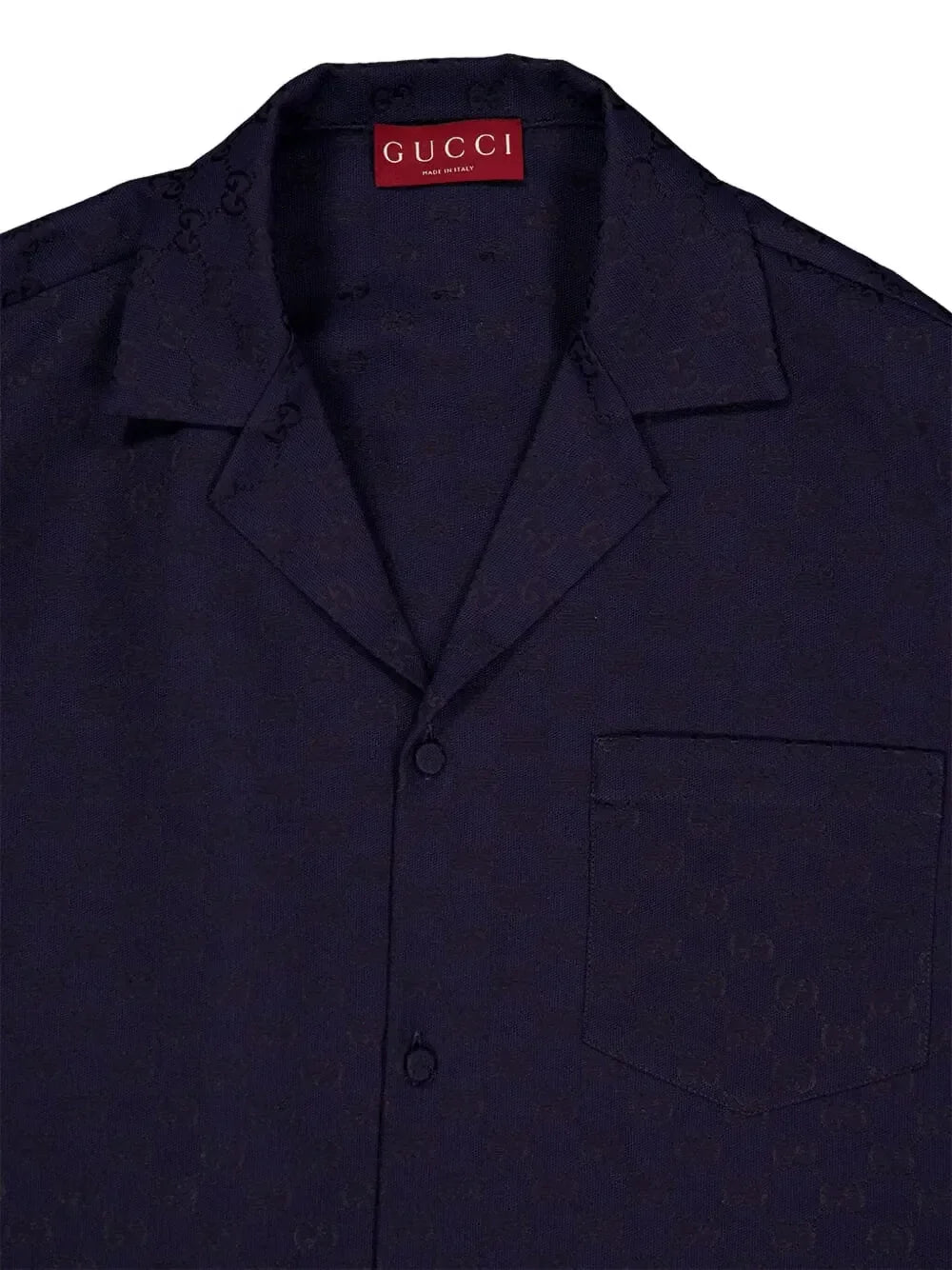 Stay stylish and comfortable with the Gucci GG canvas shirt. This oxford blue shirt features a front button fastening and buttoned cuffs for a classic look. The chest patch pocket adds a touch of practicality, while the camp collar adds a unique and playful touch. Perfect for any occasion!