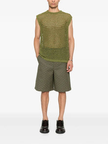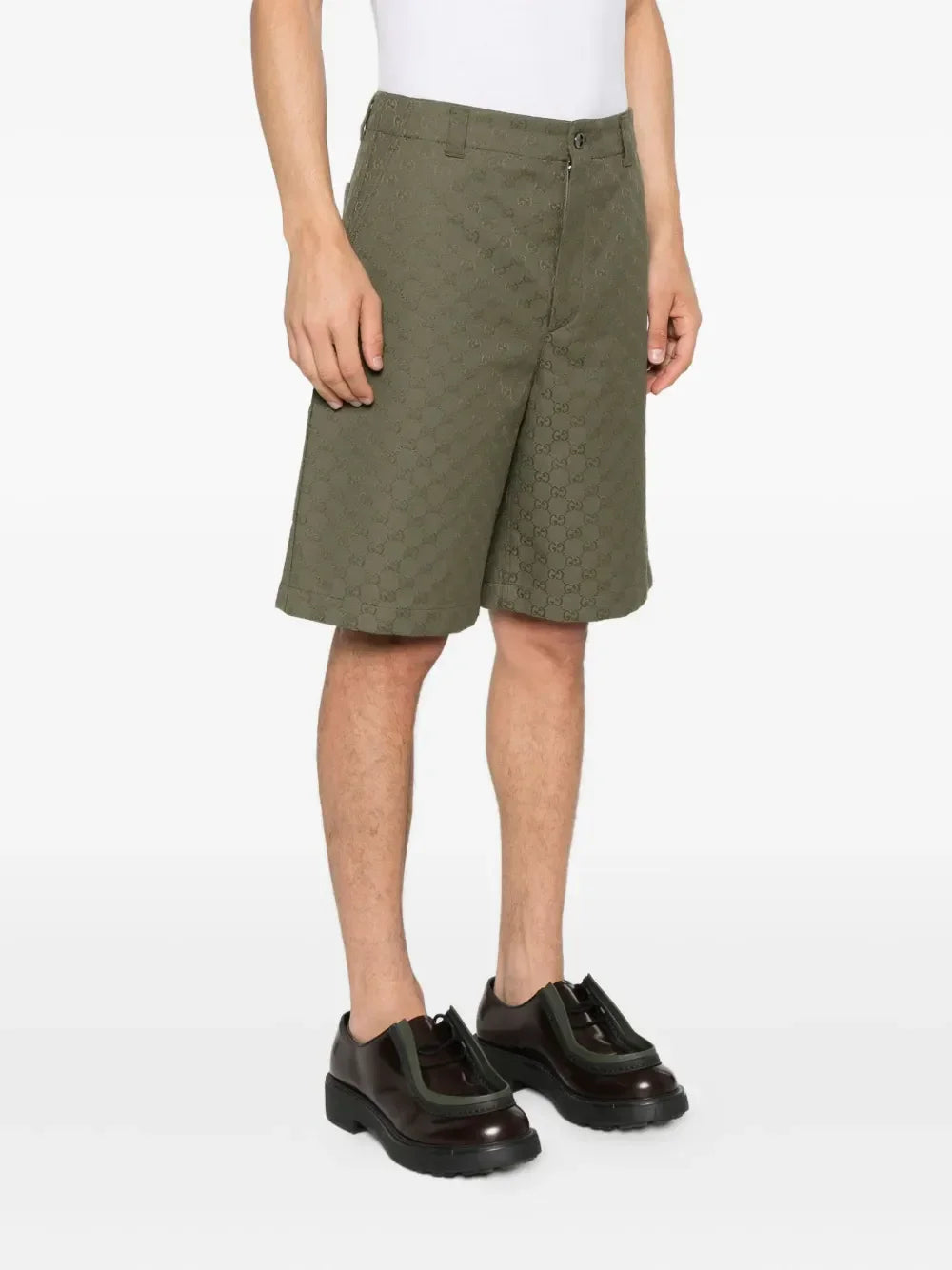 These green cotton shorts feature the iconic Gucci GG monogram pattern, combining luxury with comfort. Designed with a button fly and a flat front, they offer a sleek, tailored look. The straight hem adds a modern touch, making these shorts perfect for stylish, everyday wear.