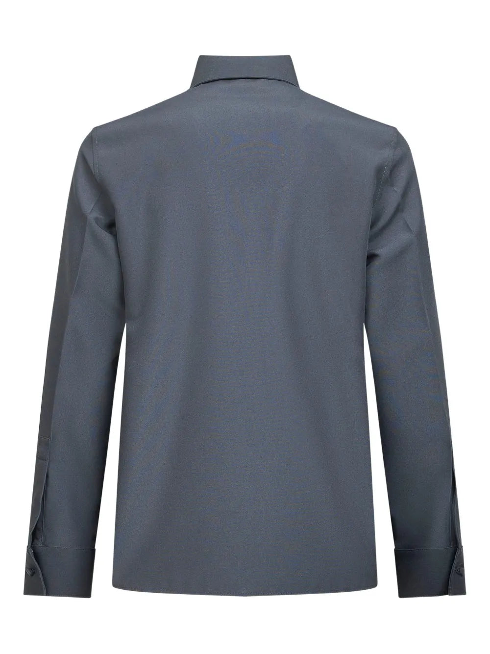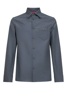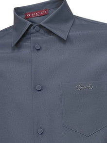 Cut in a sleek grey tone, the design features a clean button-front closure, buttoned cuffs, and a sharp chest pocket adorned with a discreet horsebit accent — a refined nod to Gucci heritage.