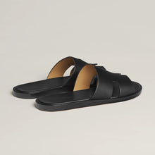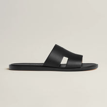 Crafted from premium calfskin, these Hermes Men's Black Izmir sandals feature the iconic "H" cut-out and distinctive raw-edged detailing. Combining timeless elegance with everyday comfort, they elevate any outfit while offering a refined, effortlessly stylish look. A must-have addition to your wardrobe for lasting sophistication.