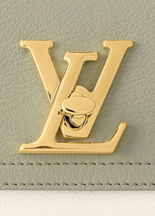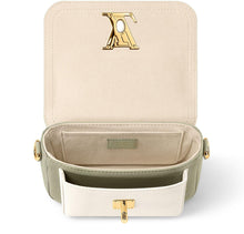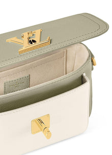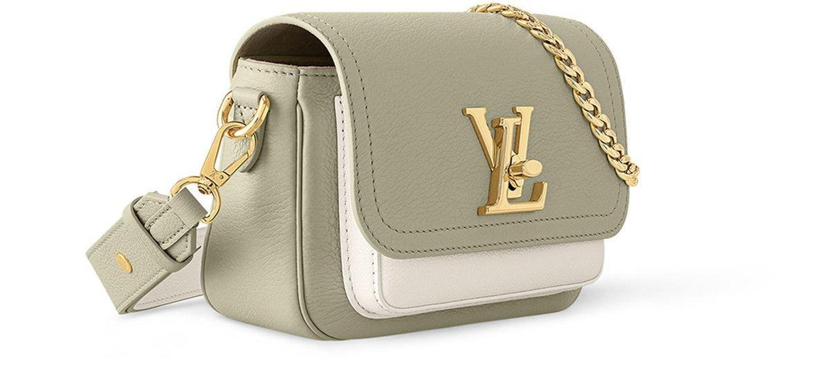 Introducing the LOUIS VUITTON Lockme Tender - a must-have for this season! Crafted from grained calf leather, this bicolor handbag in green and white is both chic and versatile. With a chain handle and LV turn lock, it's perfect for any occasion. Personalize with a charm on the detachable leather strap.