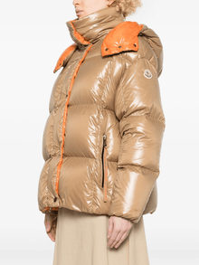 Stay warm and stylish in the Moncler Parana jacket. The sand beige color and padded design with down-feather filling provide ultimate comfort. A detachable hood, elasticated cuffs, and two side zip-fastening pockets add convenience while a logo patch at the sleeve and contrast lining add a touch of cool.