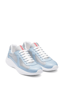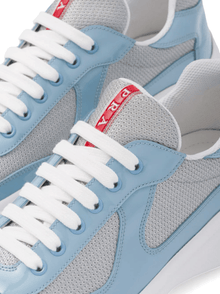 Elevate your sneaker game with Prada America's Cup light blue/light grey sneakers. These bold kicks feature a front lace-up fastening, round toe, and rubber sole - perfect for daily wear. The logo patch at the tongue adds a touch of designer flair. Made with a fabric and patent leather outer, and a fabric and rubber lining for ultimate comfort.