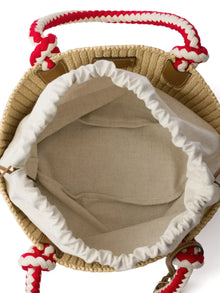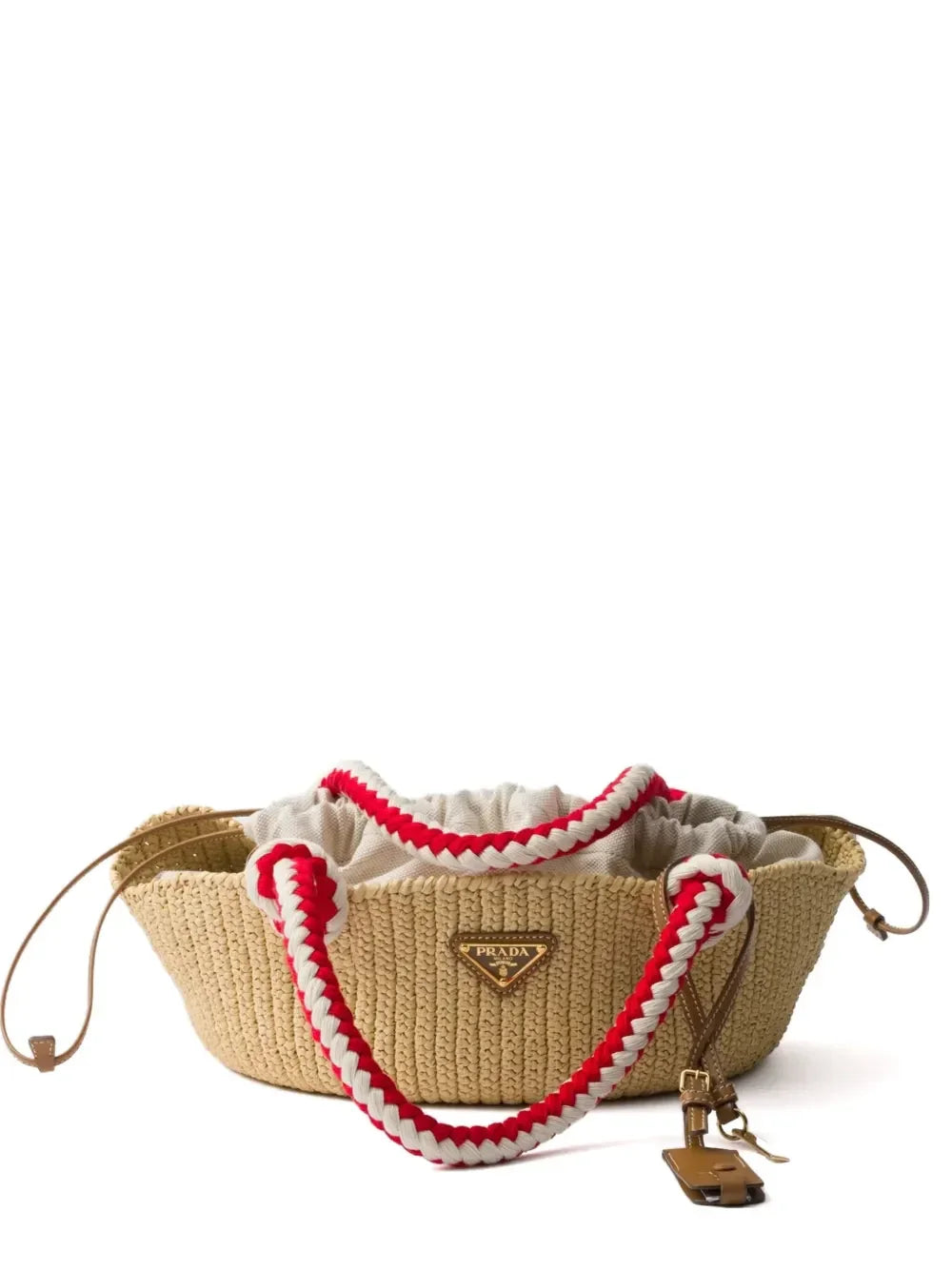 Carry chic functionality with this beige Prada bucket bag. Its braided handles and drawstring closure add a unique touch to a classic design, while the detachable keychain and logo plaque provide added utility. The white lining provides a clean contrast, making it a must-have for any fashion-forward individual.