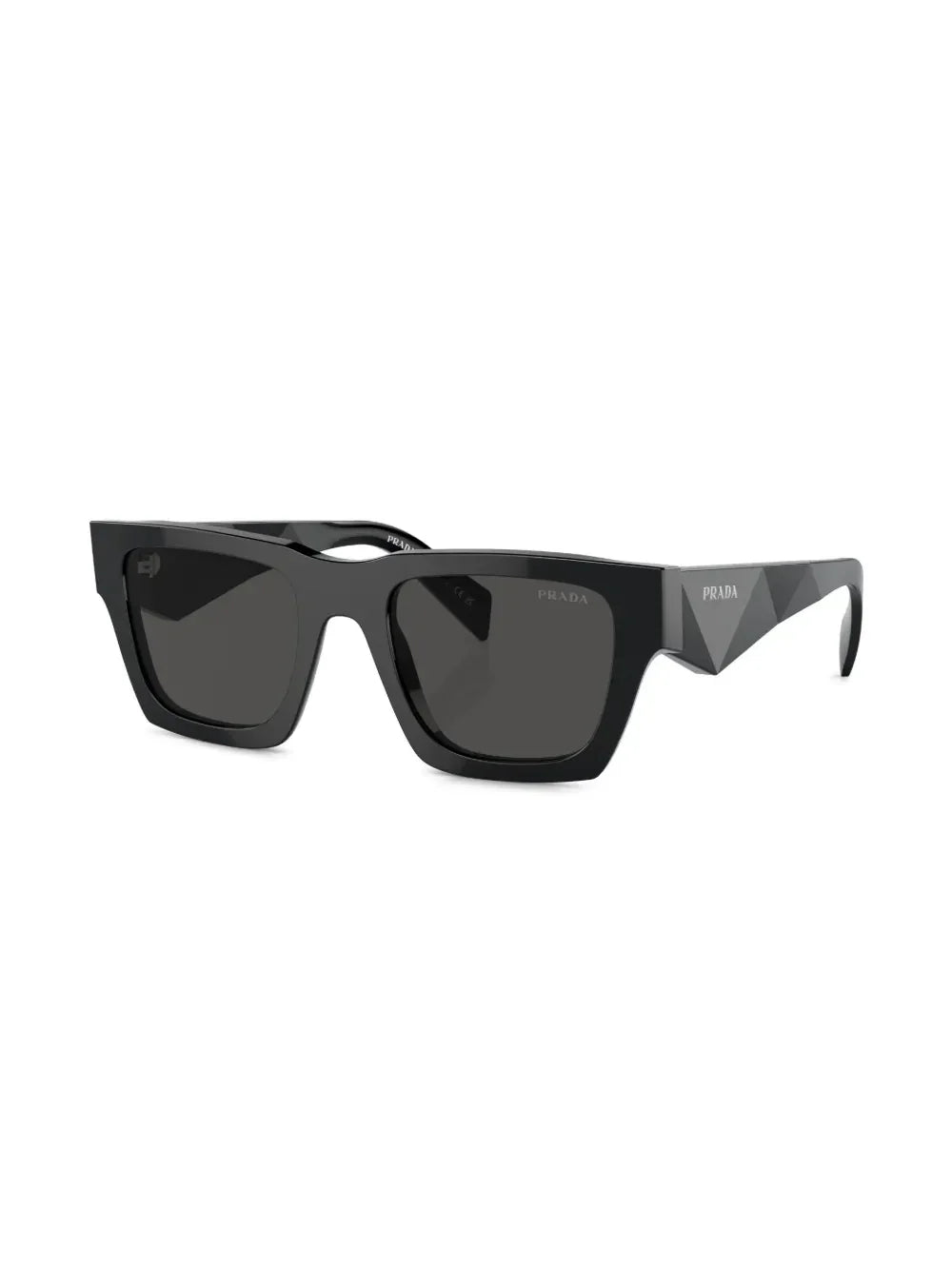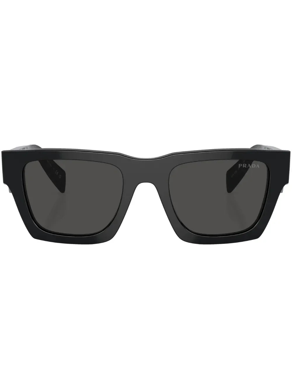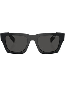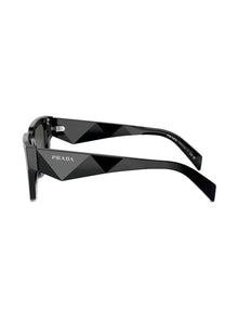 Elevate any look with Prada's Eyewear logo-lettering square sunglasses. The sleek black acetate frames are complemented by silver-tone logo lettering at the arm, adding a touch of luxury. With grey tinted lenses and sculpted arms with curved tips, these glasses not only make a fashion statement but also provide protection. Comes with a protective case.