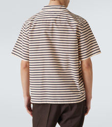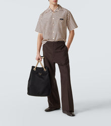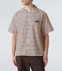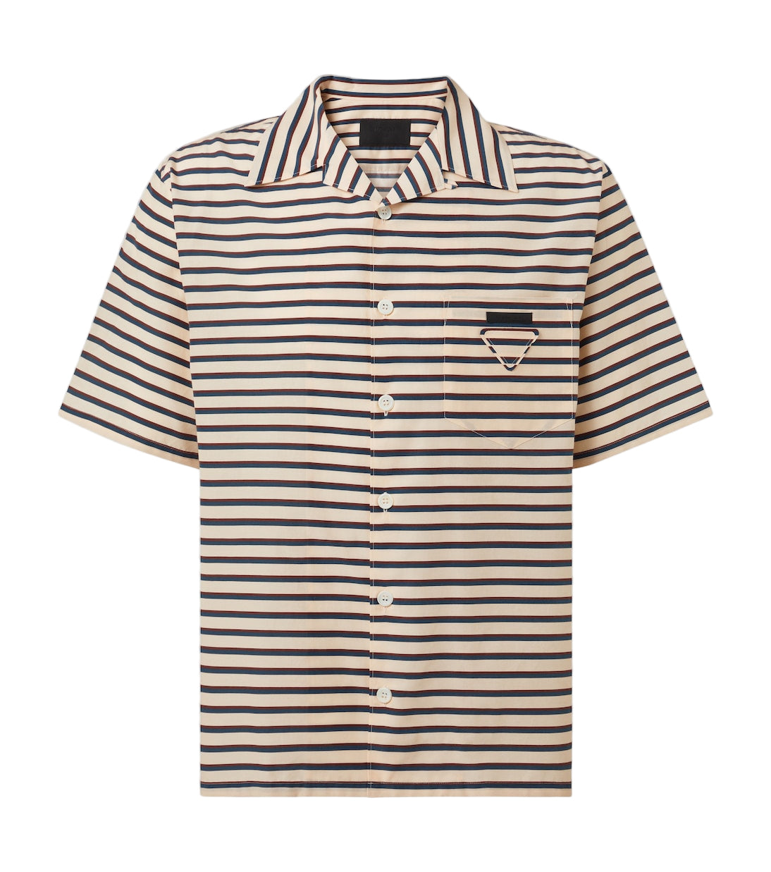 Prada refreshes the classic bowling silhouette with a refined blend of cotton and silk, creating a lightweight shirt that feels both relaxed and meticulously crafted. Rendered in the Opale palette with clean vertical stripes, the design is finished with a Cuban collar and a crisp buttoned front—an effortless balance of retro inspiration and contemporary Italian tailoring.