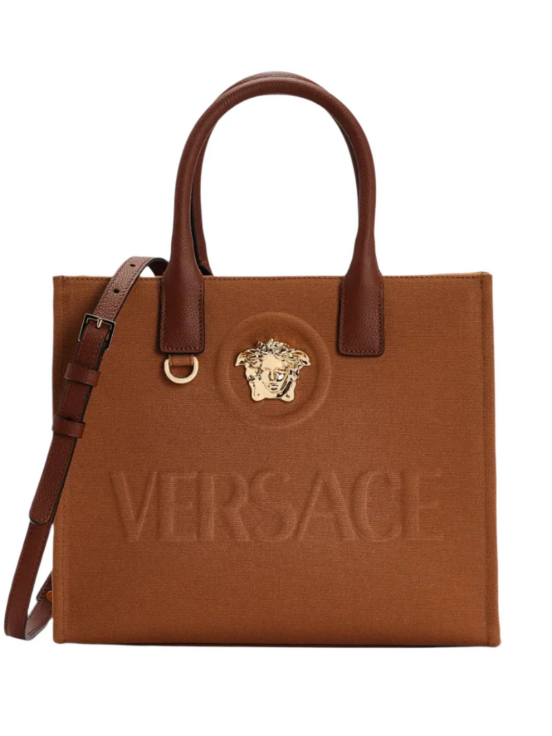 The Versace La Medusa tote bag features a versatile rust brown color, two rolled top handles, and an adjustable detachable shoulder strap for effortless carrying. The iconic embossed logo on the front adds a touch of luxury to this must-have accessory. Stylish and functional, it's the perfect bag for daily use.