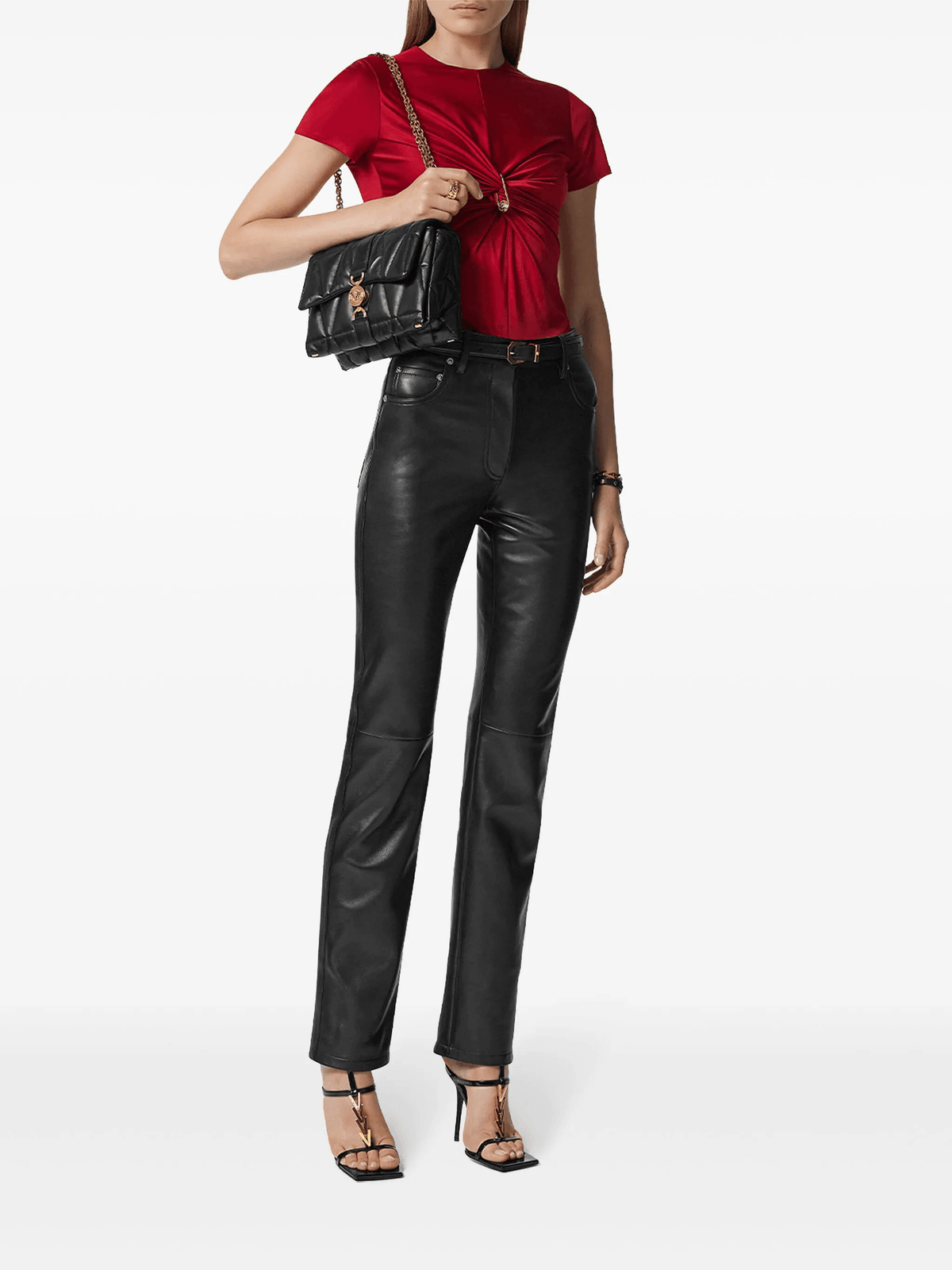 Look chic and stylish in these Versace leather trousers. Made of high-quality nappa leather, they feature a concealed fly and button fastening, a high waist with belt loops, and the iconic Medusa plaque detail. With classic five pockets and a straight leg silhouette, they are the perfect addition to any fashion-forward wardrobe.