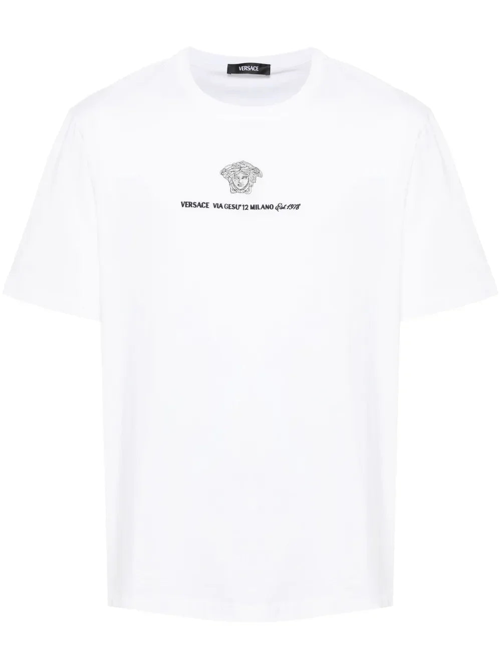 Elevate your casual wardrobe with Versace's Medusa Milano embroidered T-shirt. Crafted from lightweight cotton jersey, this white tee features a crew neck and short sleeves, finished with an embroidered logo and iconic Medusa Head motif. Versatile and stylish, perfect for any occasion.