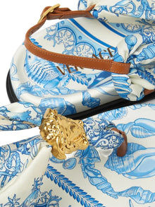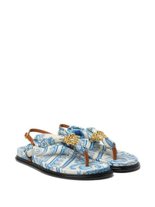 Make a bold statement with the Versace Underwater Barocco La Medusa sandals in striking blue and white. Featuring an adjustable ankle strap and flat sole, they offer both comfort and a perfect fit. The unique Underwater Barocco print and iconic Medusa plaque detail add luxurious flair, while the knotted design enhances their sophisticated style. Ideal for elevating any summer outfit with effortless elegance.