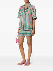 Make a splash in the Versace Underwater Barocco shirt. The mint green color complements the playful Underwater Barocco print, while the contrasting trims and notched collar add a touch of uniqueness. Made from 100% silk, this button-up shirt also features a front patch pocket for added convenience.