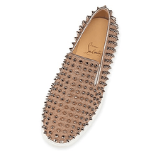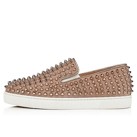 Christian Louboutin’s Roller-Boat toes the line between sneaker and boat shoe. This sporty-luxe slip-on is crafted from Courtisane-colored Glitter Mini and glistens with every evenly hand-placed pink bronze tone spike. Finished with a nappa lamé piping trim and white side elastics for easy wear.